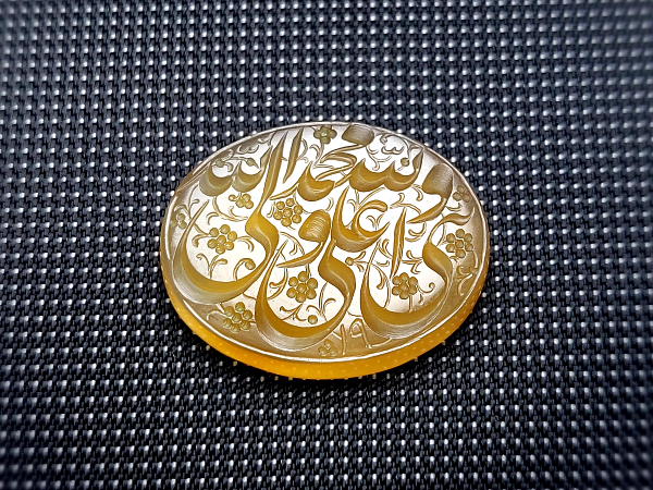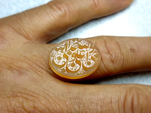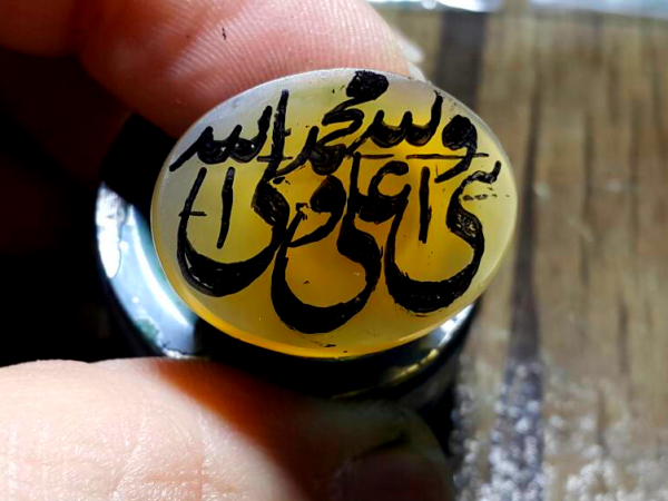عقیق یمن خطی حکاکی دستی به شیوه گود از سمت راست عمل استاد حسین شمشادی با امضای ۱۹ متن: صلوات حضرت فاطمه زهرا سلام الله علیها اَللّهُمَّ صَلِّ عَلی فاطِمَة…