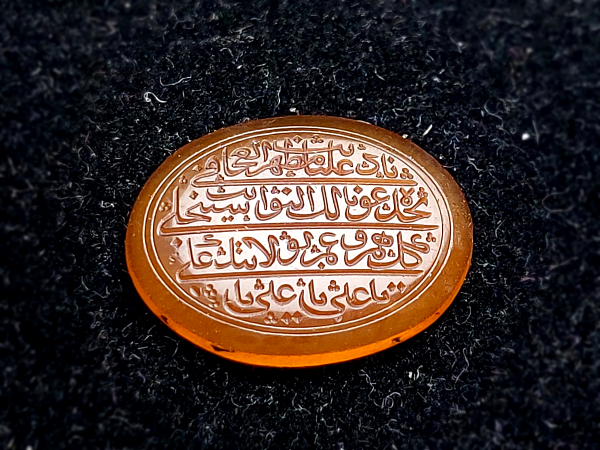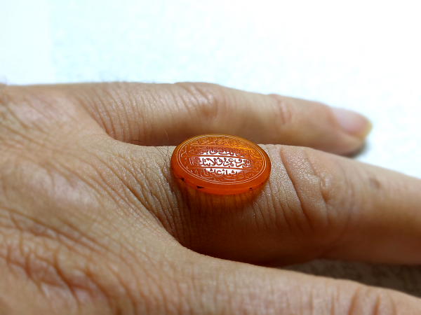 عقیق یمن خطی حکاکی دستی به شیوه گود از سمت راست عمل استاد حسین شمشادی با امضای ۱۹ متن: صلوات حضرت فاطمه زهرا سلام الله علیها اَللّهُمَّ صَلِّ عَلی فاطِمَة…