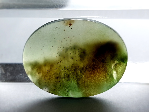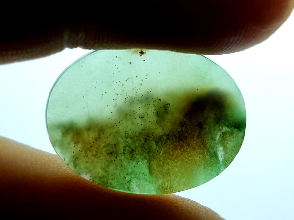 سنگ عقیق سبز اصل طبیعی کمیاب بدون هرگونه بهسازی و رنگ شدگی با درونگیرهای معدنی و تراش دستی به شکل بیضی تخت با سطوح عدسی