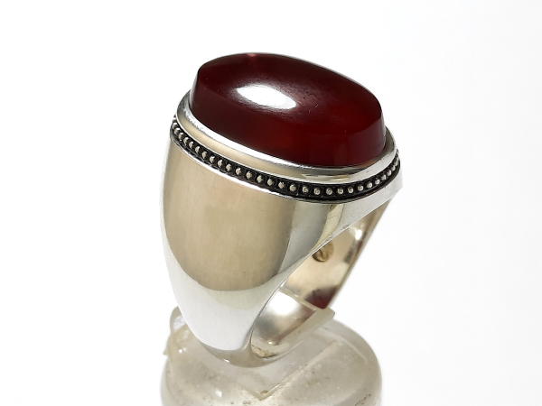سنگ نگین عقیق یمن اصل طبیعی با طبع سرخ به طول 19.1 و عرض 13.5 میلیمتر که از انگشتر قدیمی استحصال شده است.