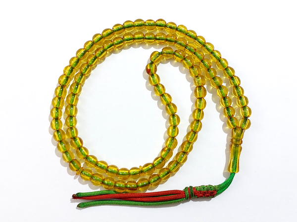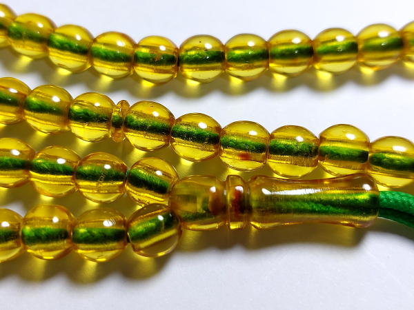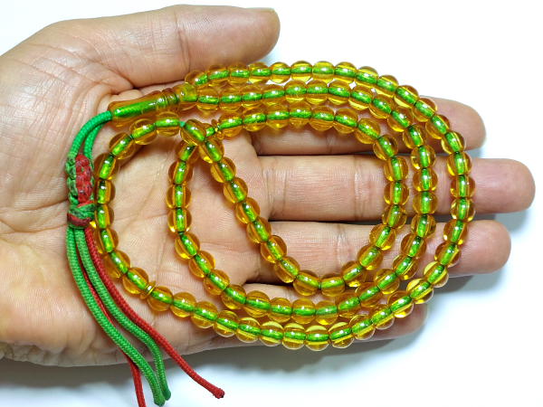 تسبیح سندلوس زرد نباتی آلمان 101 عددی کهنه با تراش دستی گرد دو سر تخت وزن کل 28.9 گرم